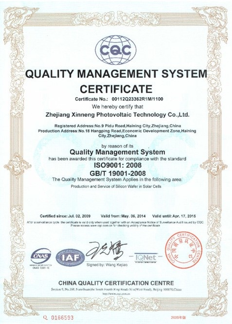 公司通過ISO9001:2000質量管理體系認證 2009-07-02 00:00:00 浙江芯能光伏科技股份有限公司 瀏覽次數 7355 上一條沒有了 下一條公司通過ISO14001:2004環境管理體系認證