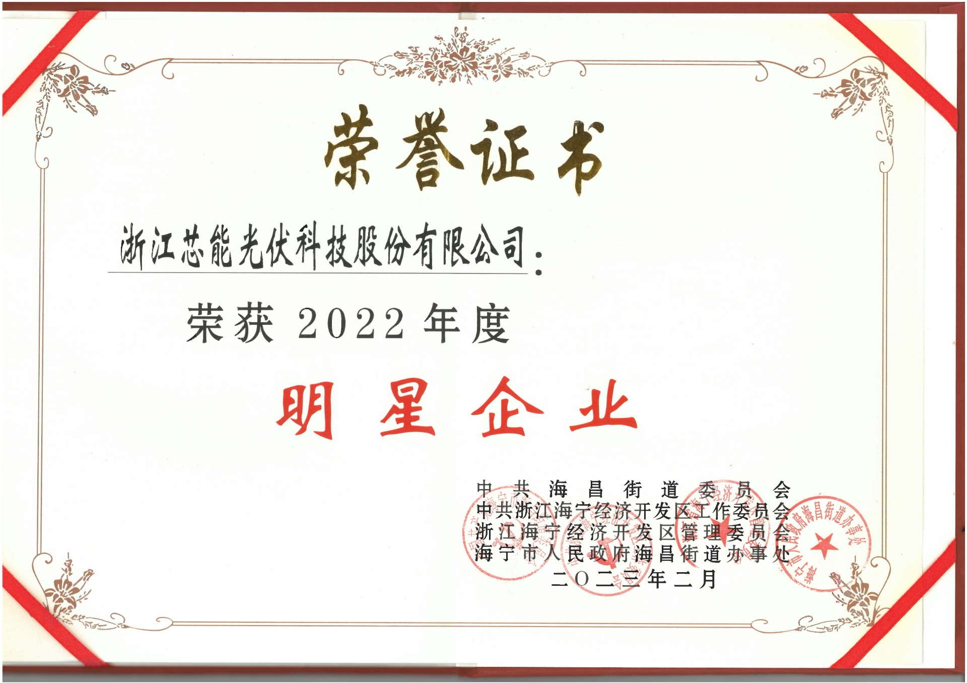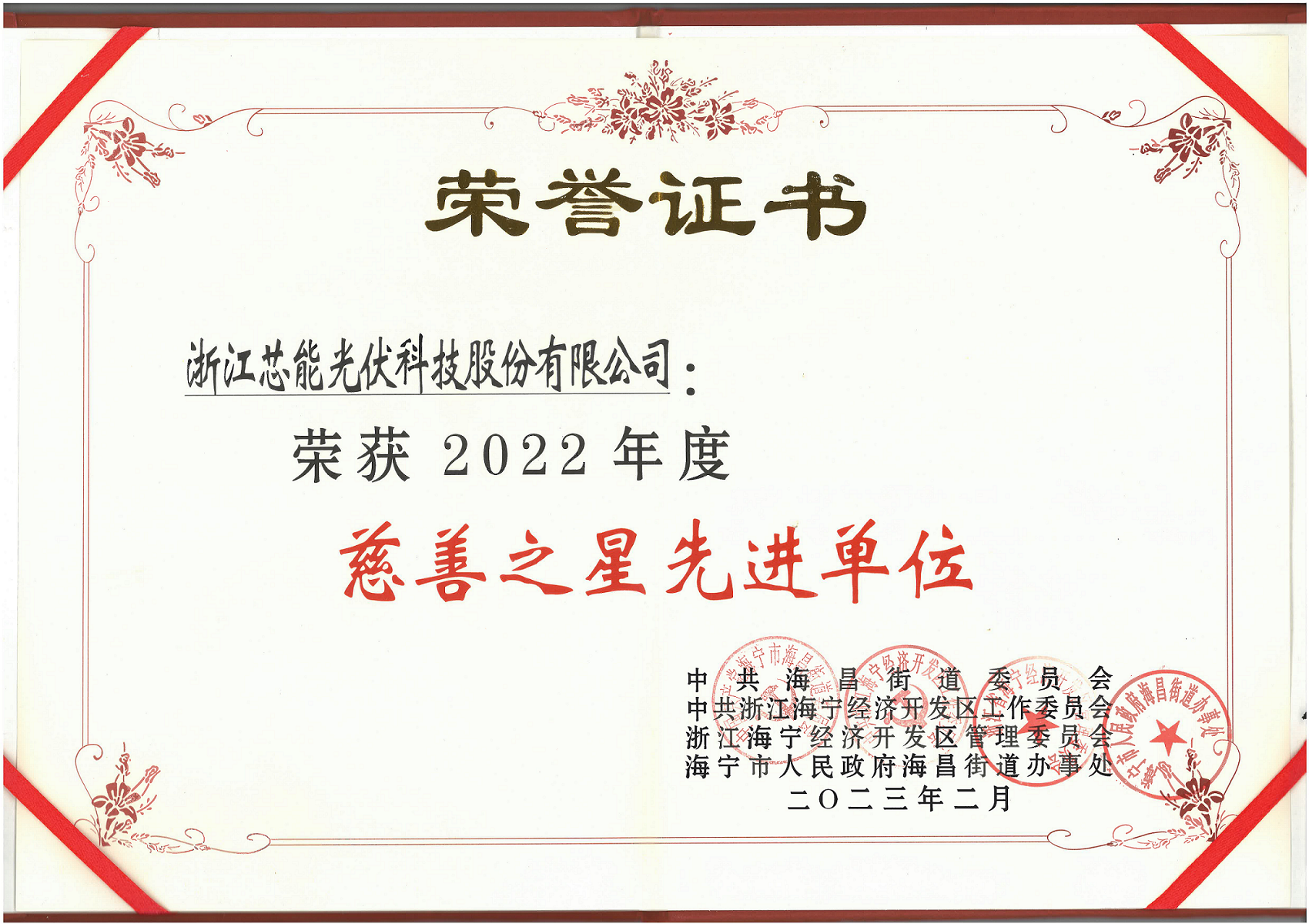 2023年2月8日,在海寧經濟開發區、海昌街道“以最優營商環境 賦能高質量發展”2023年度經濟工作大會上,芯能科技榮獲2022年度明星企業和慈善之星先進單位。